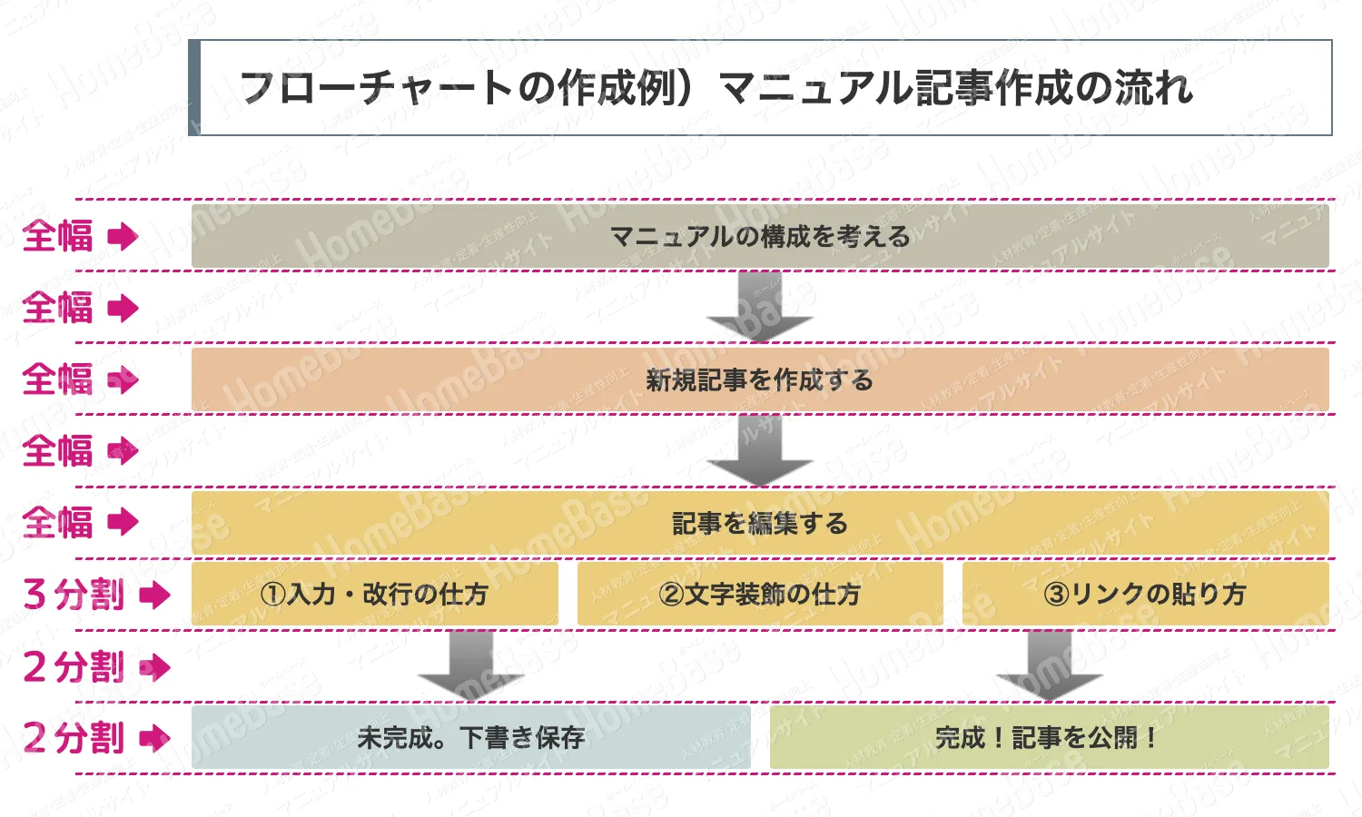 2分割以上の「分割」は、編集画面上でわかりやすいように背景に色がつきますが、実際に公開されたマニュアル記事上では色はつきませんのでご安心ください。