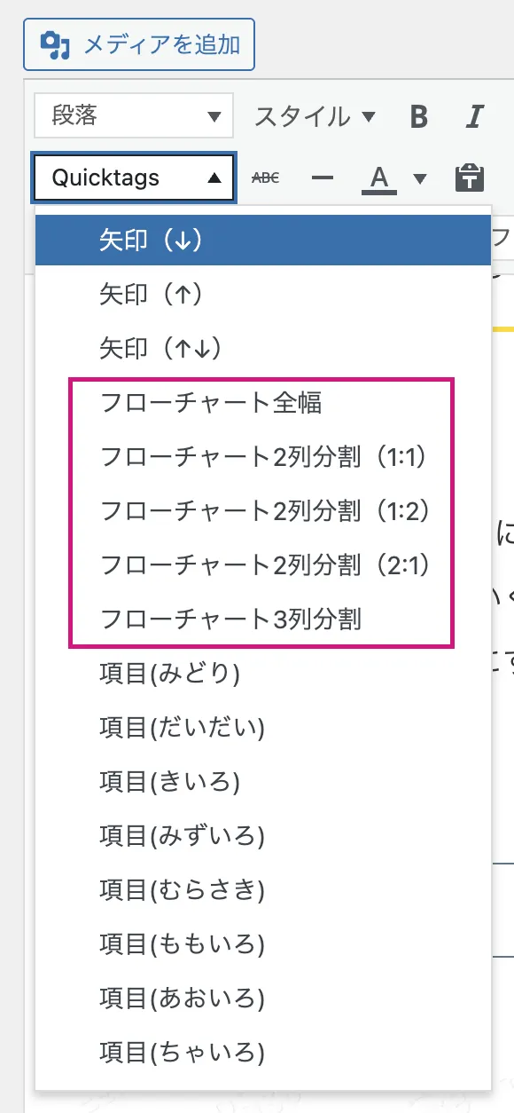 「分割」は、ツールバーの「Quicktags」と書かれているところから選んで入力します。